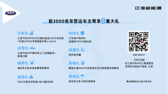 值得一提的是,江淮iC5推出创新零售模式,开启线上APP销售,切实为大家提供“不用出门的便利”。自2月26日起,用户可以在“江淮汽车APP”上进行咨询购买。此外为回馈北京用户对江淮新能源的关注与期盼,在预售期间支付意向金,更可优先享受8重大礼。