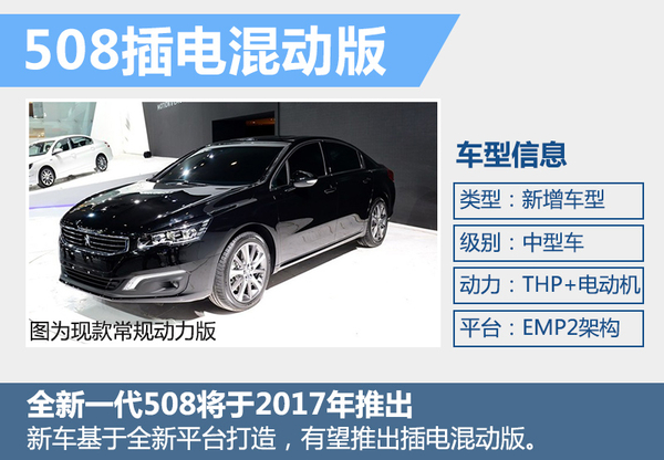 508定位于中型车市场,是目前东风标致旗下尺寸最大、级别最高的轿车产品。现款508基于PSA 3号平台进行打造。根据官方公布的消息,标致全新一代508将在2017年正式推出。新车将基于EMP2模块化平台进行打造,由东风标致进行在华本土化生产。在转用EMP2平台之后,全新一代508将具备推出插电混动版本的能力。未来插电混动版车型推出后同样有望在华实现投产。