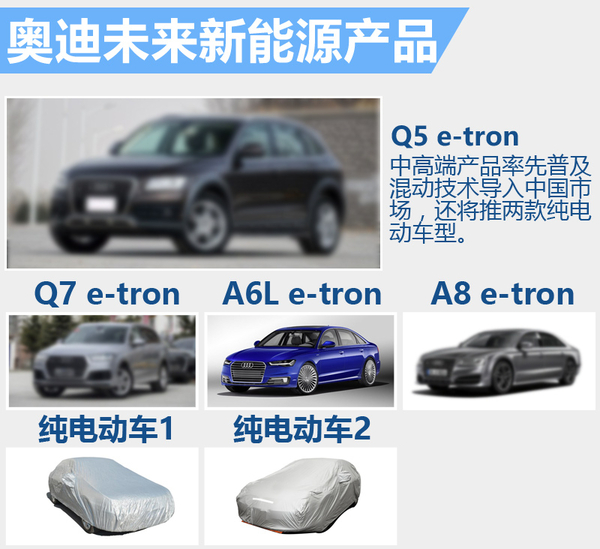 在A3 e-tron推出后,奥迪将与大众集团的新能源战略同步,逐渐进入新能源车型的中国导入期。今年,首款国产插电混动车型——A6L e-tron在长春投产随后上市,未来奥迪中高端产品将率先普及混合动力技术导入市场或者在华国产。2016年奥迪Q7和A6L e-tron混动版本将正式推出,随后2017年Q5和A8 e-tron也将投放市场,截止到2018年前奥迪还将有两款纯电动车型。