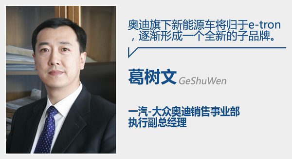 据悉,奥迪计划在全系车型上配备e-tron版。“未来奥迪旗下新能源车型将全部归结在e-tron,逐渐形成一个全新的子品牌”一汽-大众奥迪销售事业部执行副总经理葛树文表示。e-tron成为独立的新能源品牌后,销售渠道上也有望与奥迪现有网络进行区分,为消费者提供更好的购车体验。