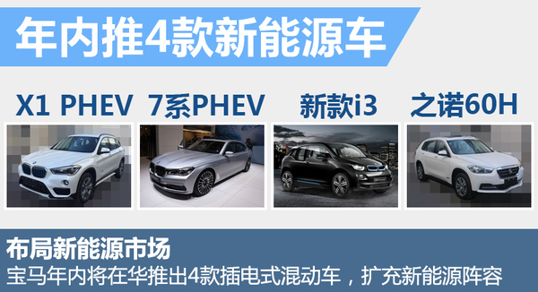 宝马此前发布的第一战略中明确表明:将加快新能源产品的布局,未来每一款产品都将对应一款插电混动车型,来满足消费者对于车型的需求,进一步提升整体利润。中国作为宝马全球最大的单一市场,也将成为新能源产品投放的重点市场。2016年,宝马将加速在国内的新能源产品投放。宝马X1插电混动版、7系插电混动版、新款i3以及之诺全新插电混动SUV,这四款新能源车型都有望于年内在华市场推出。