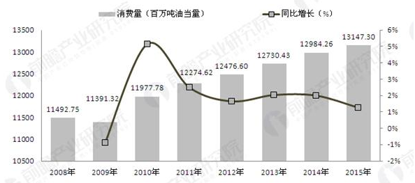 2008-2015年全球能源消费总量及同比增速(单位:百万吨油当量,%)