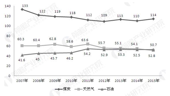 2007-2015年全球传统能源的储采比情况(单位:年)